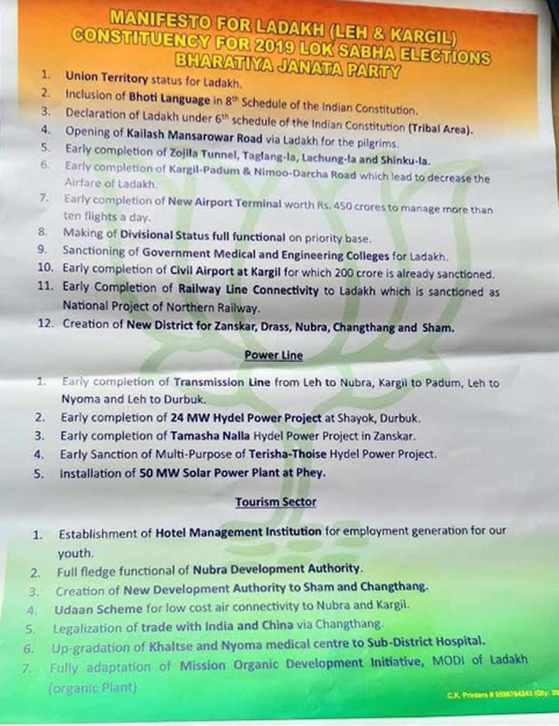 In the BJP’s election manifesto for Ladakh Constituency for 2019 Lok Sabha polls, the party, at point number three, had promised “declaration of Ladakh under Sixth Schedule of Indian Constitution (Tribal Area)”.